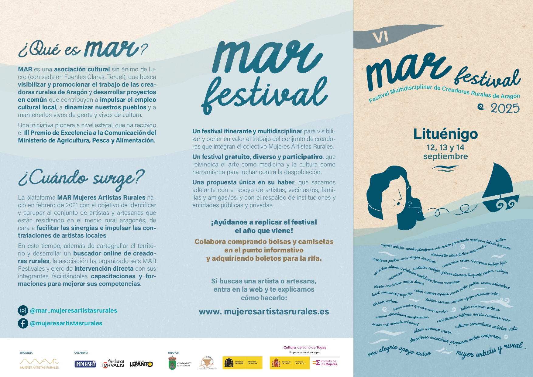 MAR Festival es un festival gratuito, itinerante y multidisciplinar cuyo objetivo principal es visibilizar y poner en valor el trabajo de las creadoras que integran la plataforma MAR – Mujeres Artistas Rurales.